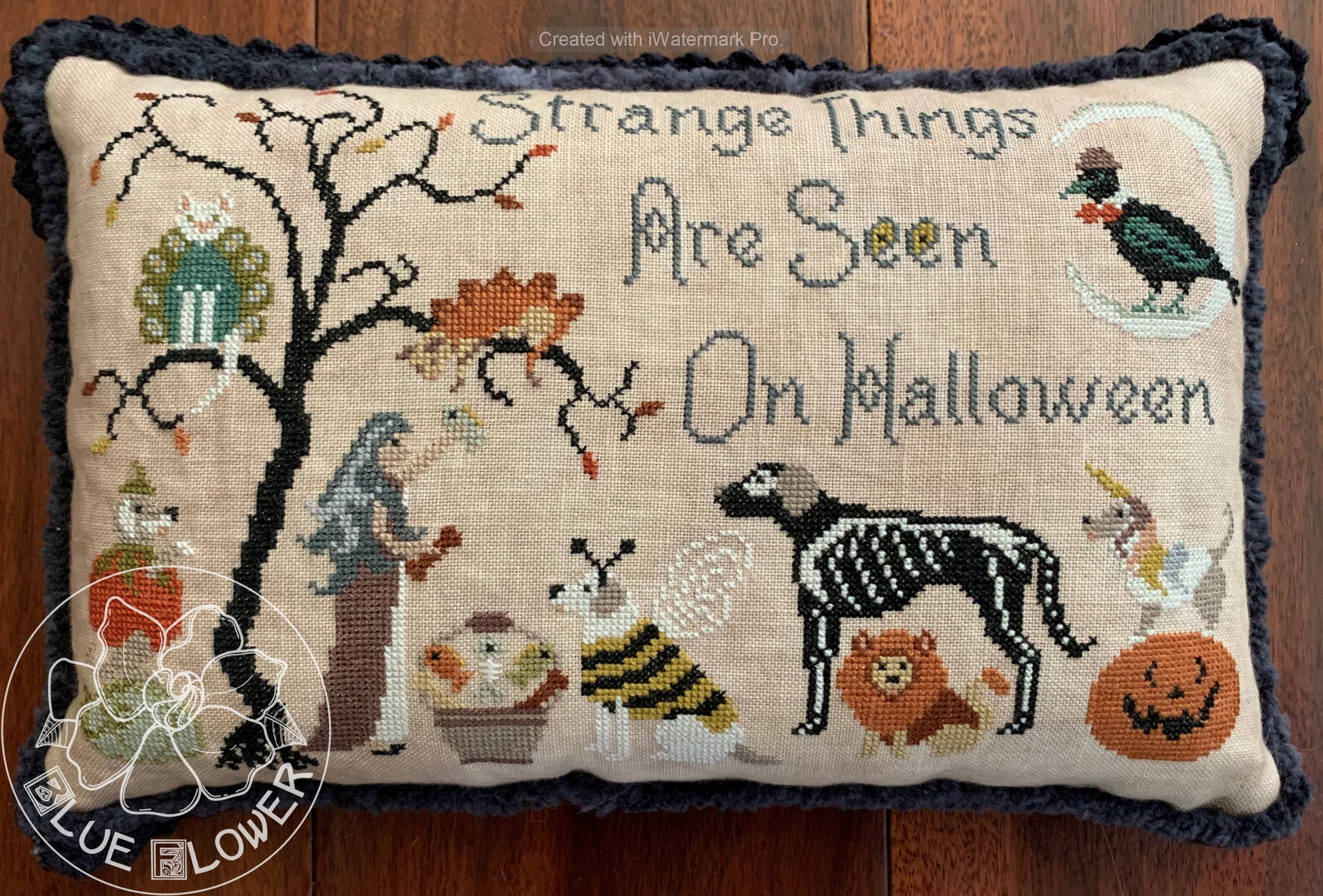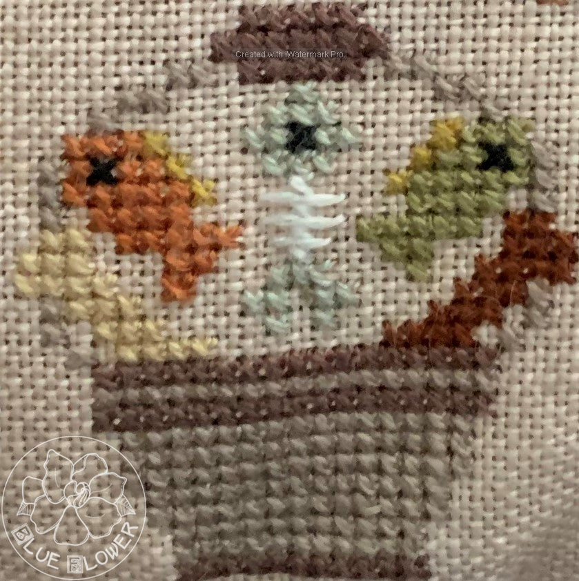 In designing this piece, I was imagining that our pets had gone out to trick or treat. They would receive dog bones and fish instead of candy, of course, and I had quite a bit of fun playing with the various costumes. The model is stitched on 40 count "Egyptian Sand" linen from Mountain Aire Fabrics. The stitch count is 183 wide x 120 high. The pillow is finished with "Mary Jane" lace and "Licorice" chenille trim, both by Lady Dot Creates. The model is stitched with DMC threads. This chart is available as a .pdf download, or from your local needlework shop.
