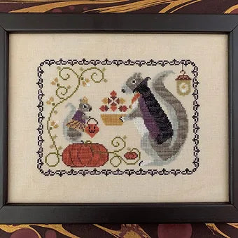 This is a continuation of the "Seasonal Squirrels" group, called "Halloween Squirrel". I've added a flamboyant costume for this squirrel, accompanied by a tiny squirrel picking up her acorn "treats." Stitch count is 129 wide x 93 high. The model is stitched on 40 count "Winter Brew" linen from R&R Reproductions.