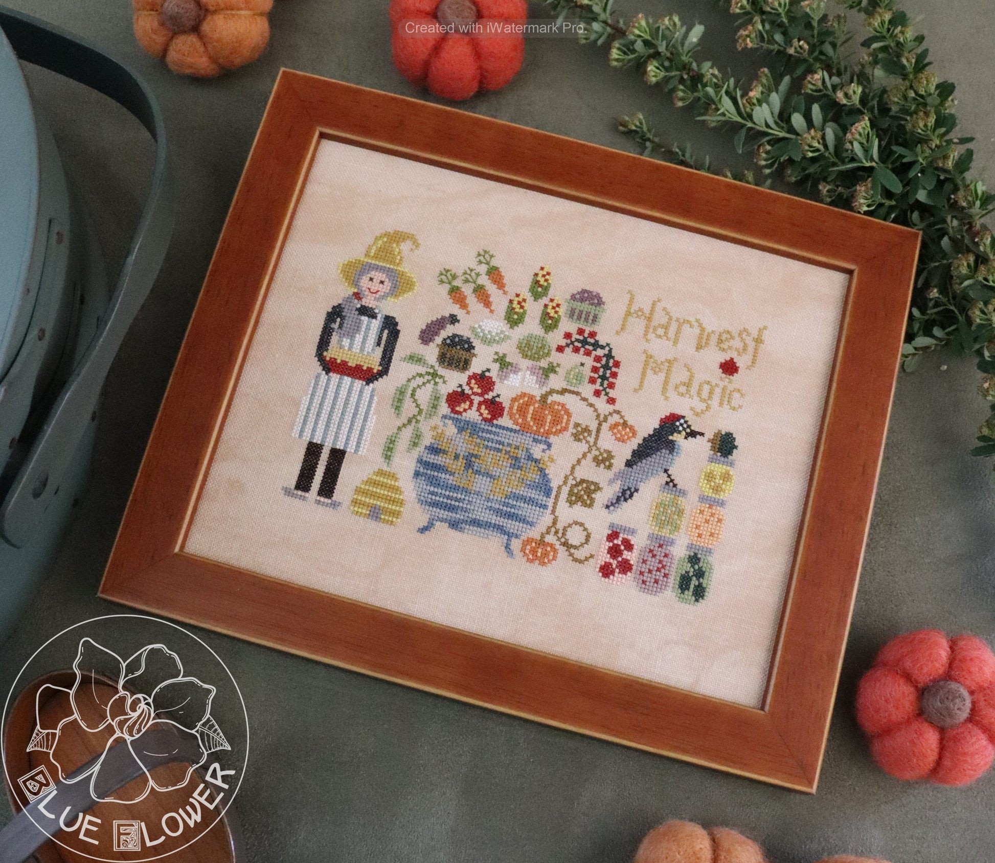 This is the latest in the "Magic" series, and is centered on the bounty of harvest. The "cauldron" is stitched with "Salt Glaze" thread, and was inspired by the colors of a pickling crock. The design features fruits and vegetables, canning jars, and an Acorn Woodpecker (known for storing acorns in trees).