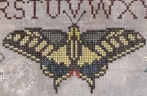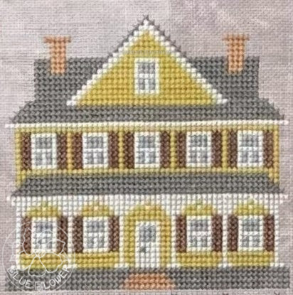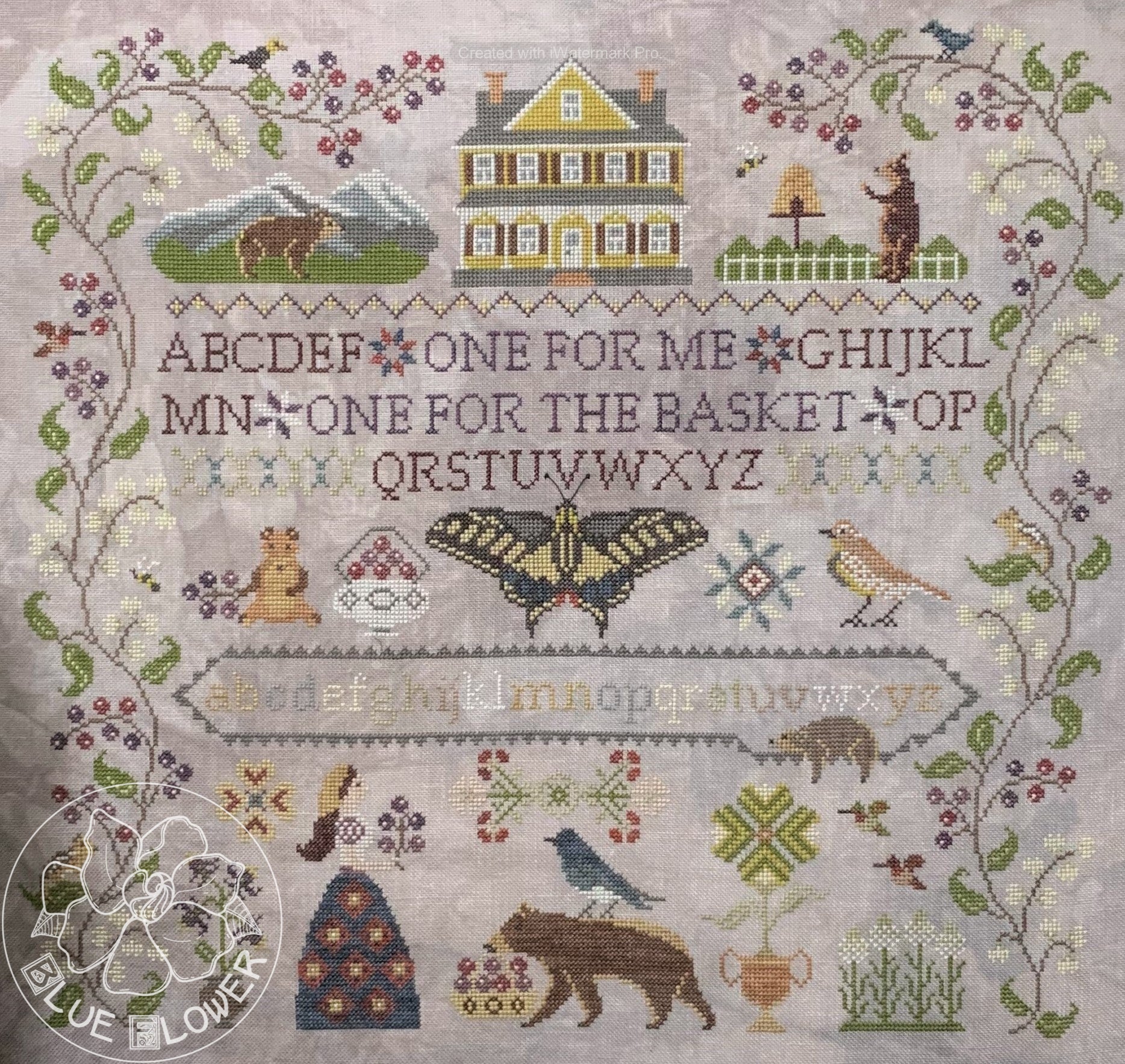 I've always associated bears with huckleberries, so I've created a lovely farmhouse featuring huckleberry vines and bears. The model is stitched on 36 count "Shale" linen by Picture This Plus. The stitch count is 252 wide x 229 high.