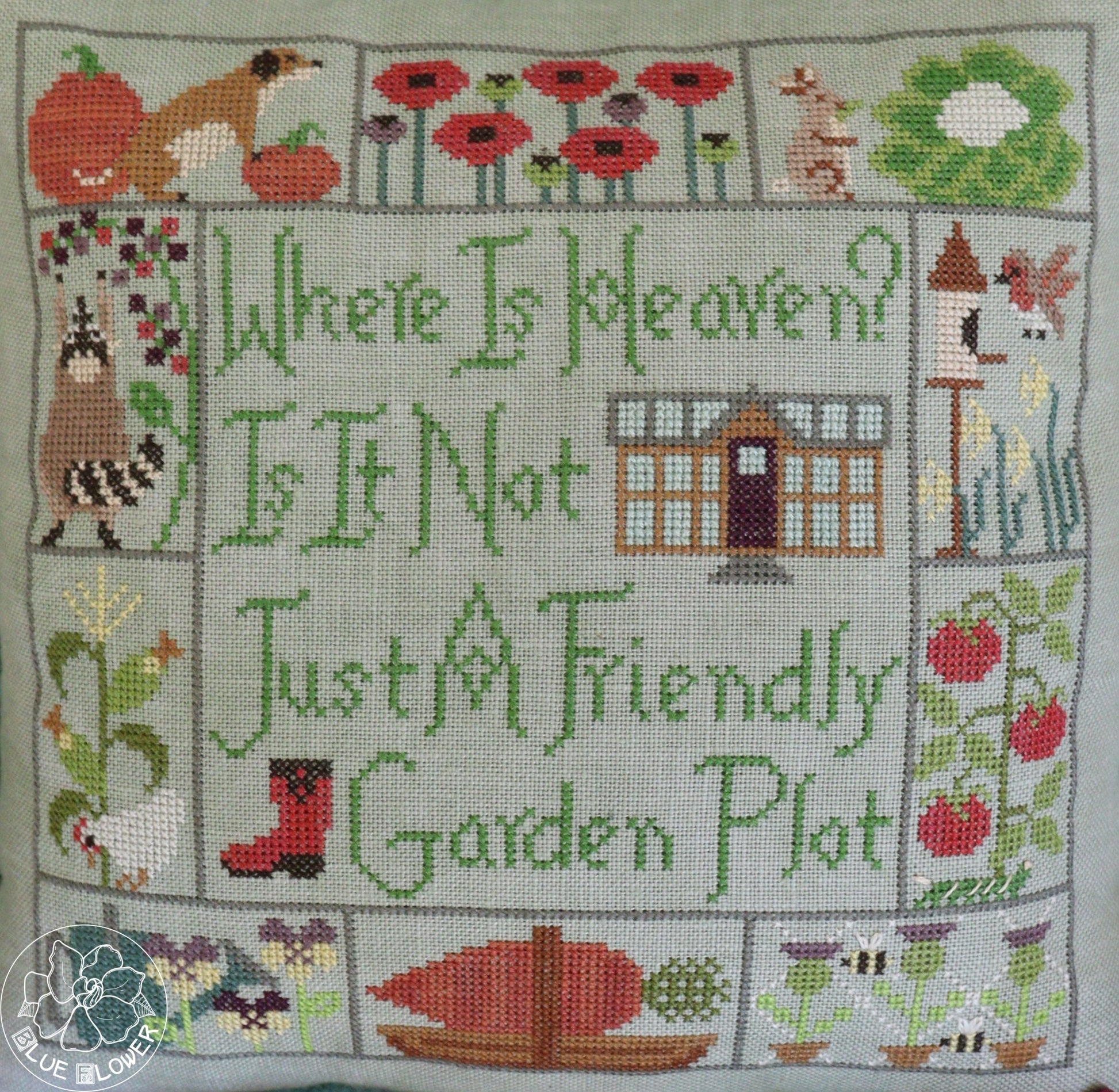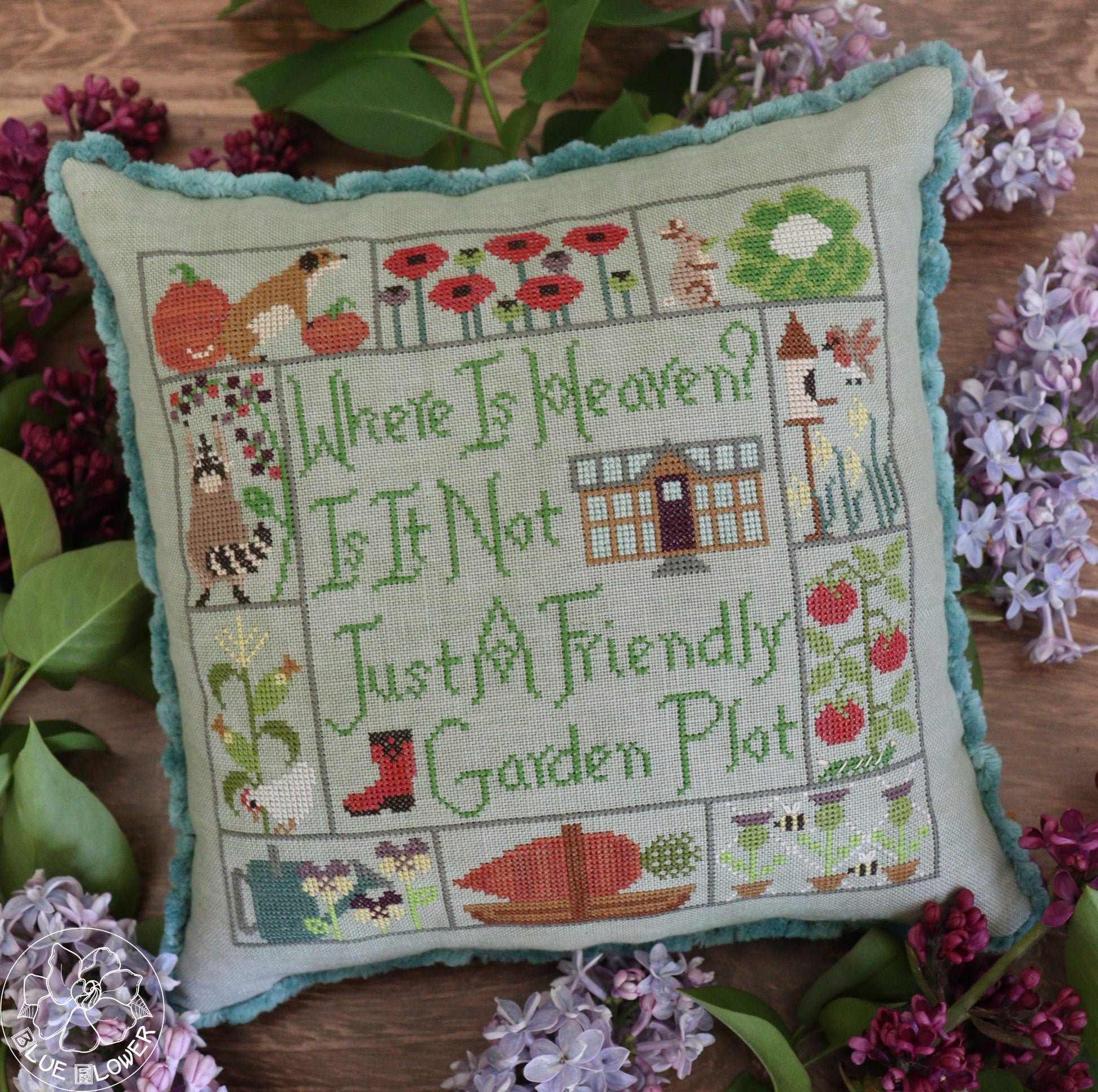 The model is stitched on 40 count "Fern Green" linen from xJudesign. Stitch count is 125 wide x 127 high. The model is trimmed with Odgen Grass chenille and String Bean velveteen, both from Lady Dot Creates.