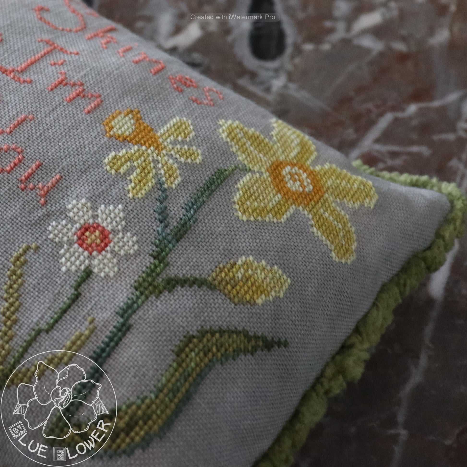 This is the second in the Language of Flowers series. In the depths of winter I always begin to dream of spring flowers (like daffodils). This particular design comes from one of the meanings assigned to Narcissus flowers - "The sun shines when I'm with you." The model is stitched on 40 count "Cyprus" linen from Fiber On A Whim. Stitch count is 165 wide x 82 high. The model is trimmed with "Algae" chenille and backed with "Blue Fescue" velveteen, both from Lady Dot Creates. The chart calls for a mix of silk threads, and a DMC conversion is included.