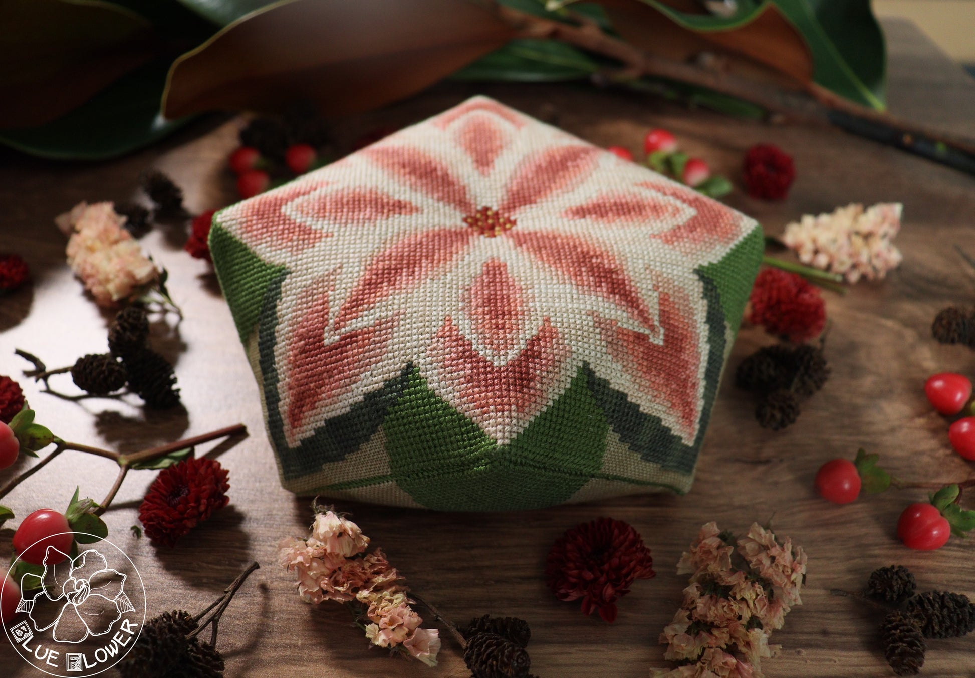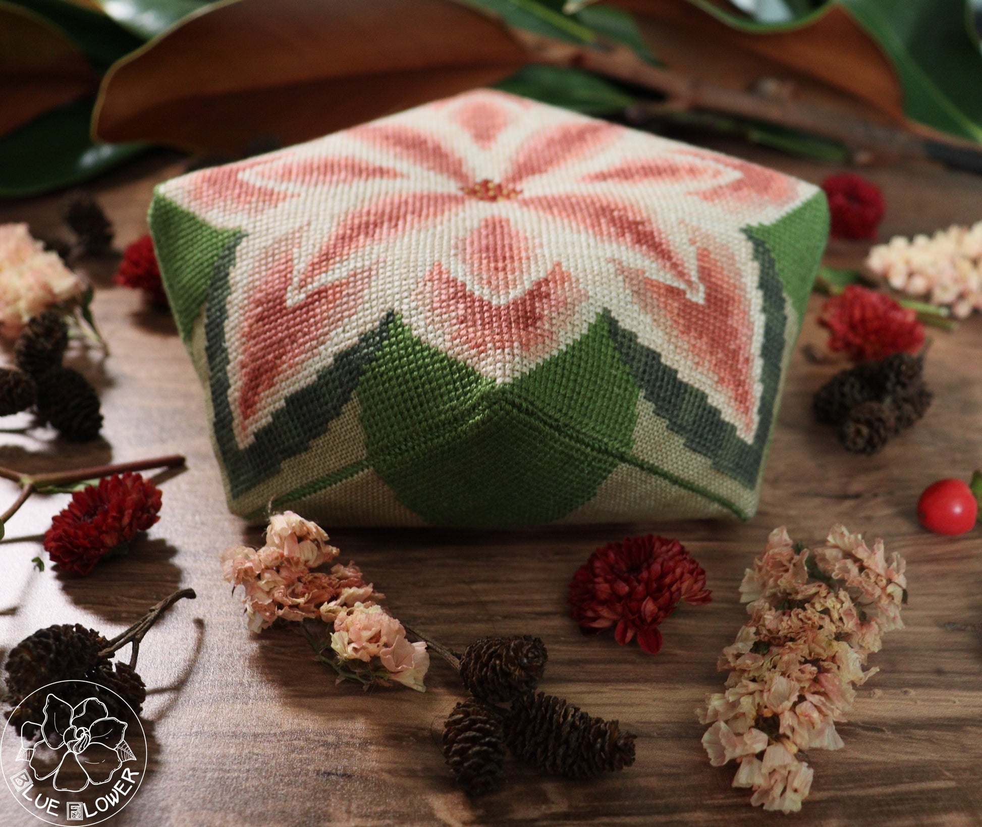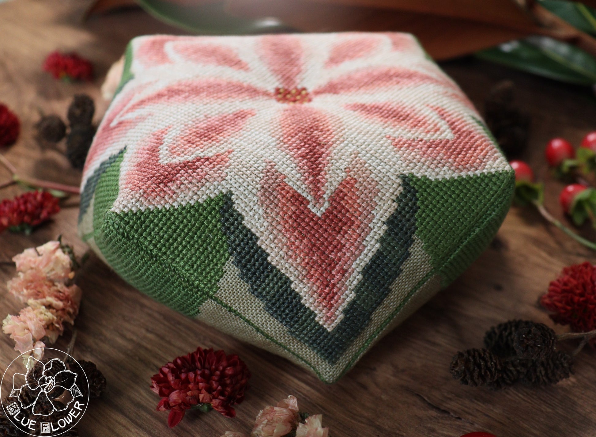 I really wanted to capture one of my favorite seasonal blooms in a biscornu format. There's a lot of stitching in this, but the results came out just the way I'd hoped and I love the dramatic effect.