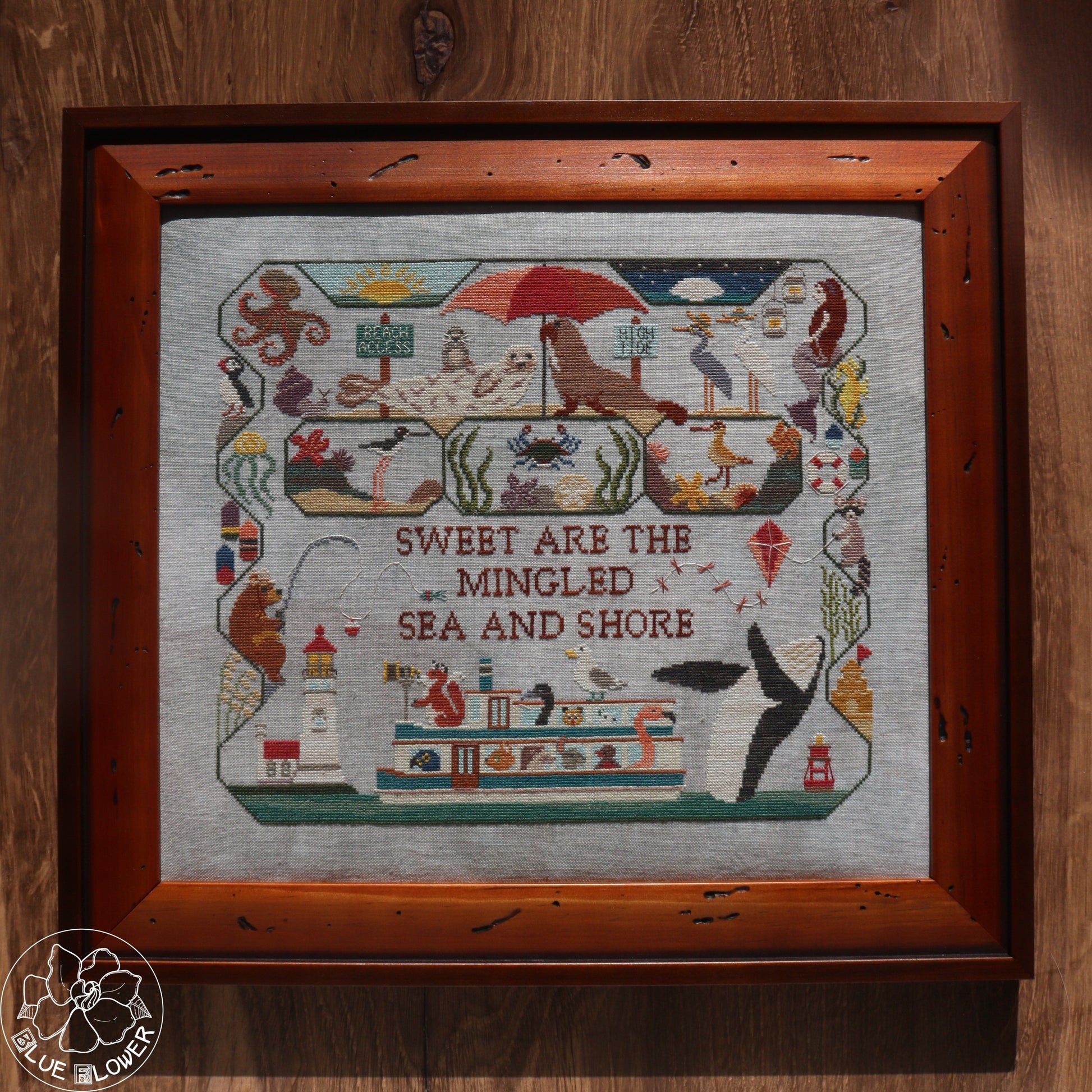 This piece celebrates the joy of visiting the shore. Inspired by Happy Campers, this design has a whole new cast of characters enjoying their outing to the sea. The border keeps things interesting with lots of different motifs. Instead of a building in the lower panel, I've included a vintage style ferry boat laden with a variety of animal passengers. And they can enjoy a whole range of seaside activities, including visiting a tidepool and lounging in the sand.