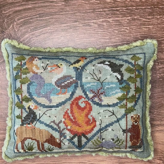 Inspired by the amazing variety of the Oregon coast, here are a diverse cast of characters enjoying s'mores on the beach! Stitch count is 101 wide x 80 high and the model is stitched with one strand of thread over two strands of linen. Special thanks to Laurie Dyche for stitching the model.