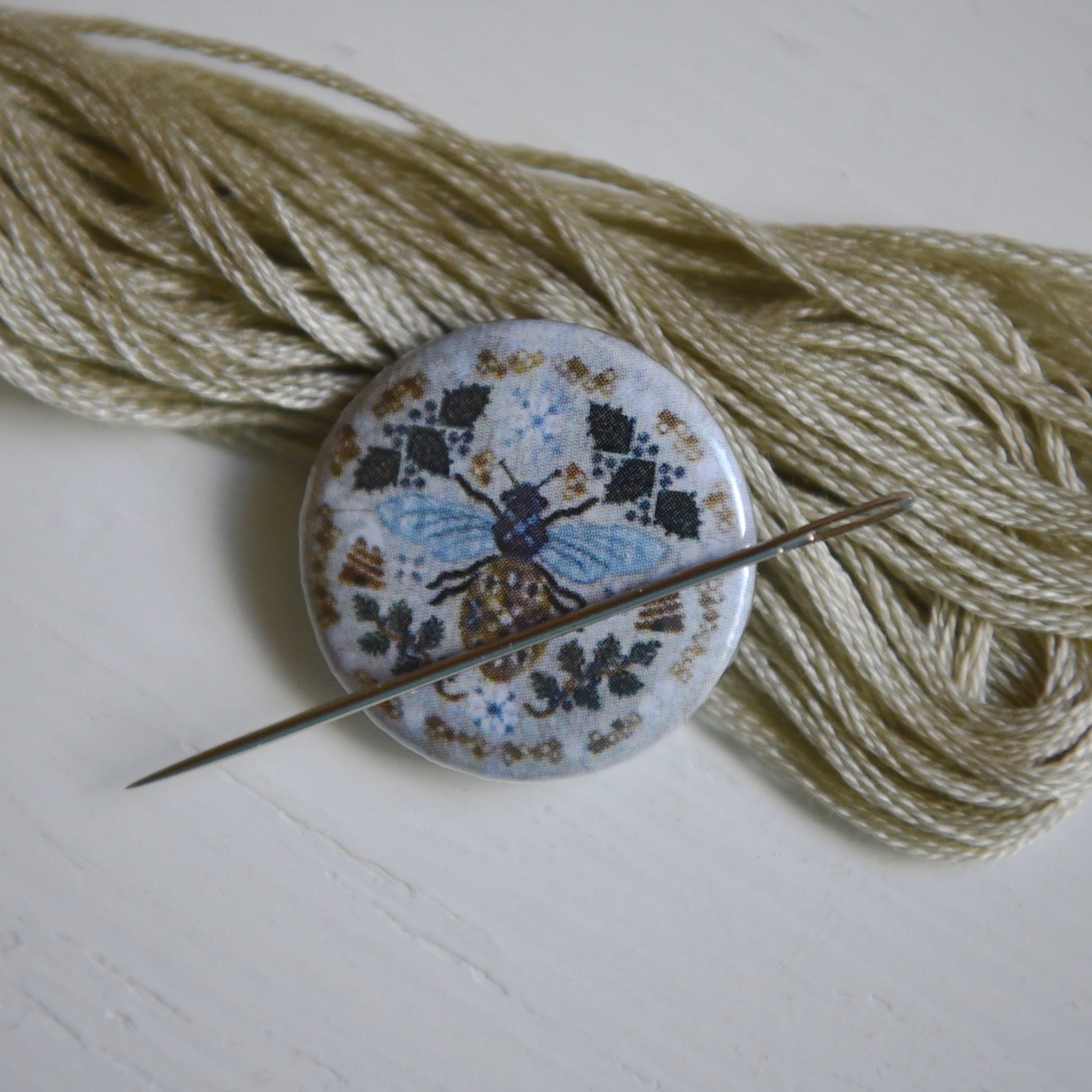 This design was inspired by the muted landscape of early morning walks in the high desert winter.  The model is stitched on 40 count "Vintage Fawn" linen by Lakeside Linens.  The stitch count is 151 wide x 151 high.  The model is trimmed with Sequoia pom trim (from Lady Dot Creates) and presented in an 8" needlework box from LeHays Shaker Boxes (www.leyahs.com).
