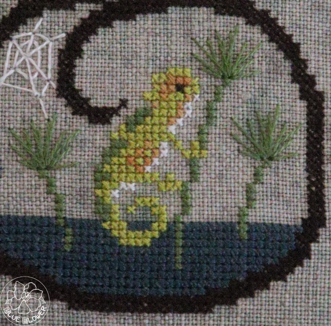The model is stitched on 40 count "Elixir" linen from xJudesign. (It's a mottled fabric but my estimate of the closest DMC equivalent is 502/647 with darker and lighter variegation.) Stitch count is 99 wide x 132 high.