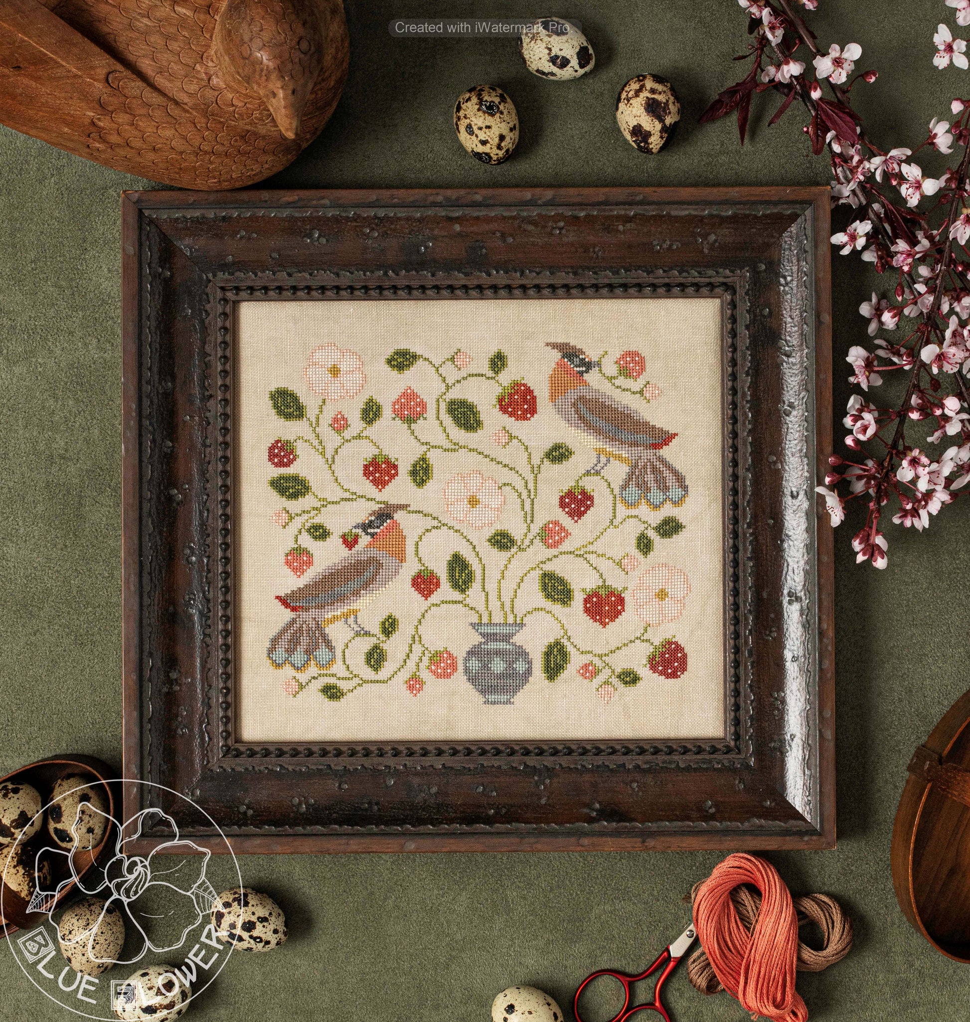 This design is inspired by lovely Cedar Waxwing birds enjoying a feast of strawberries.