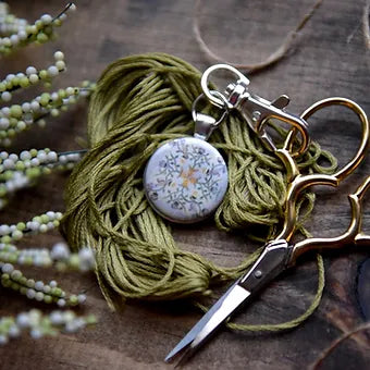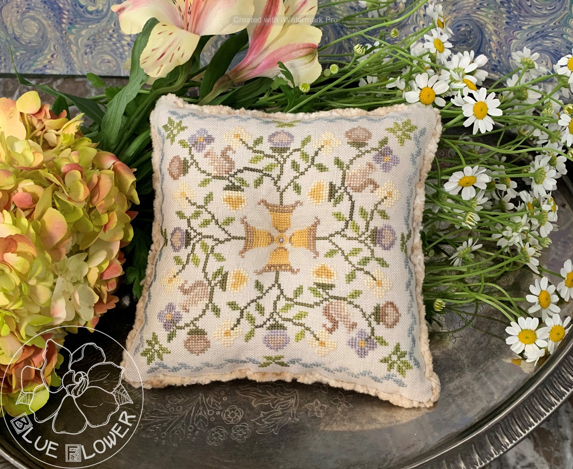 This is the companion piece to "Summer Squirrel." The model is stitched on 40 count "Vintage Gray" linen by R&R Reproductions. The stitch count is 103 wide x 103 high. The model is trimmed with "Vintage" chenille trim (from Lady Dot Creates).