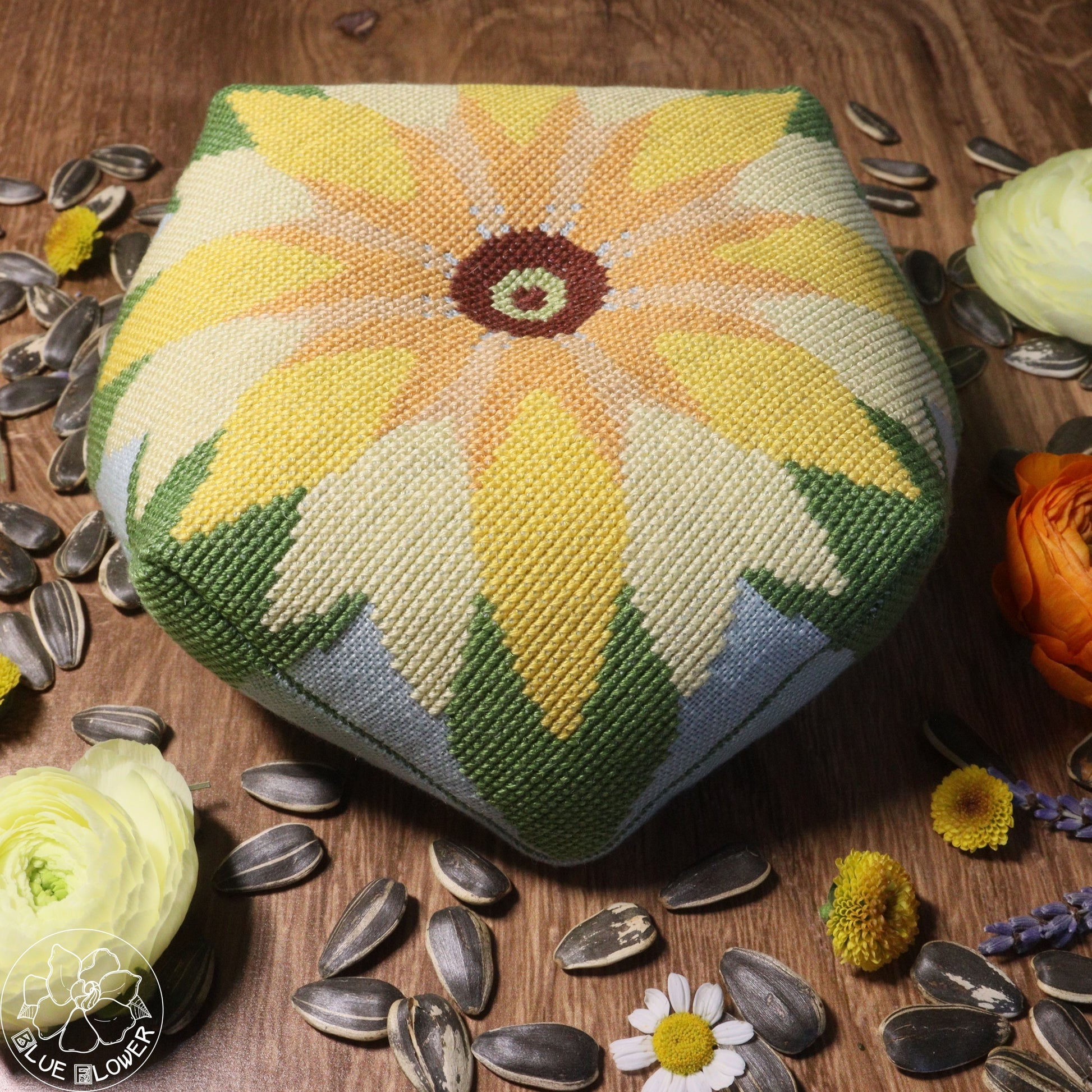 This cheerful design celebrates one of my favorite summer flowers. (The birds in our garden appreciate them as well.) Finished as a biscornu, this is designed with all DMC threads to make it easy for stitchers to substitute threads and make adjustments. Sunflowers come in a range of colors so I hope you enjoy making this your own with your thread choices!