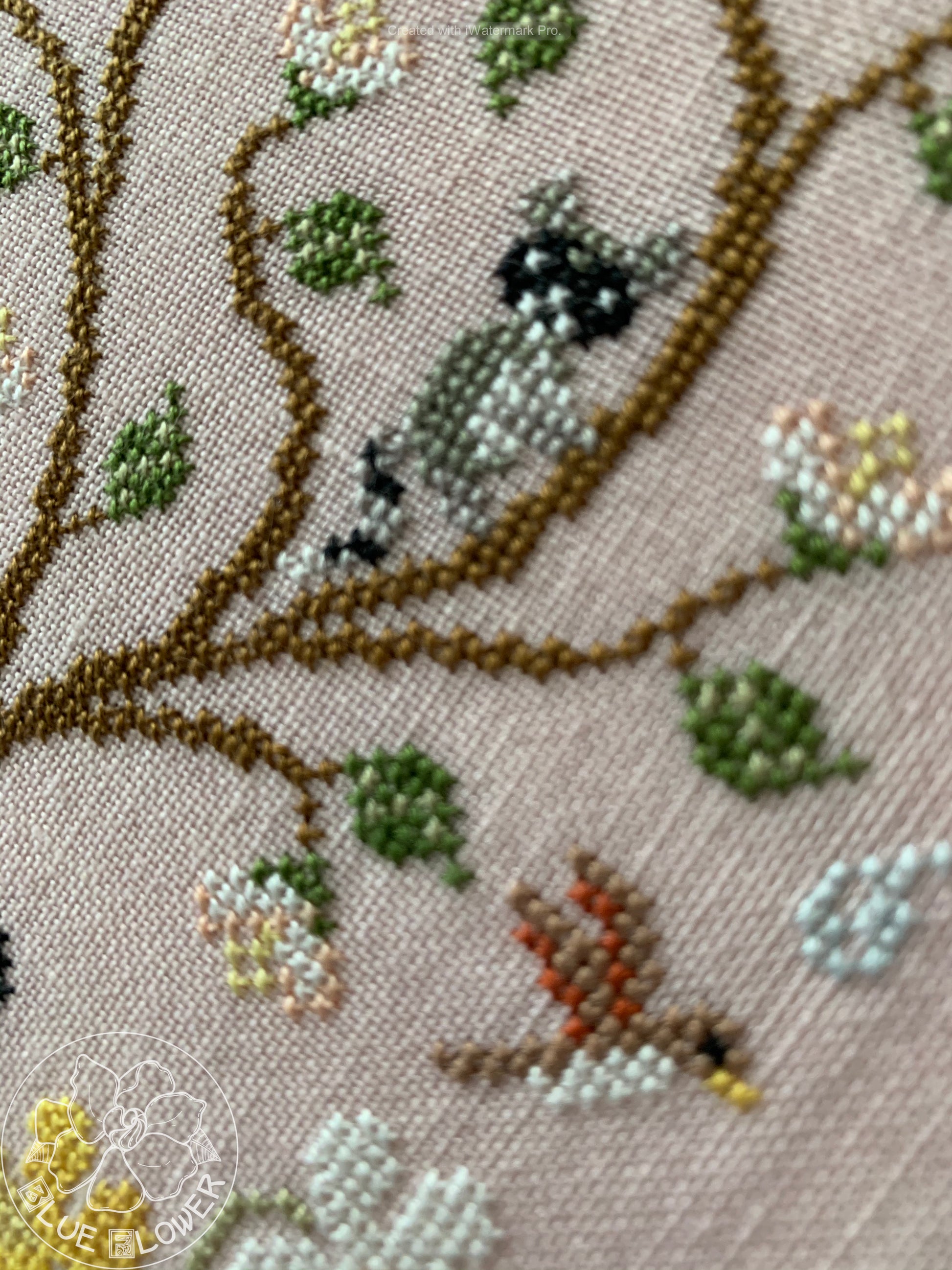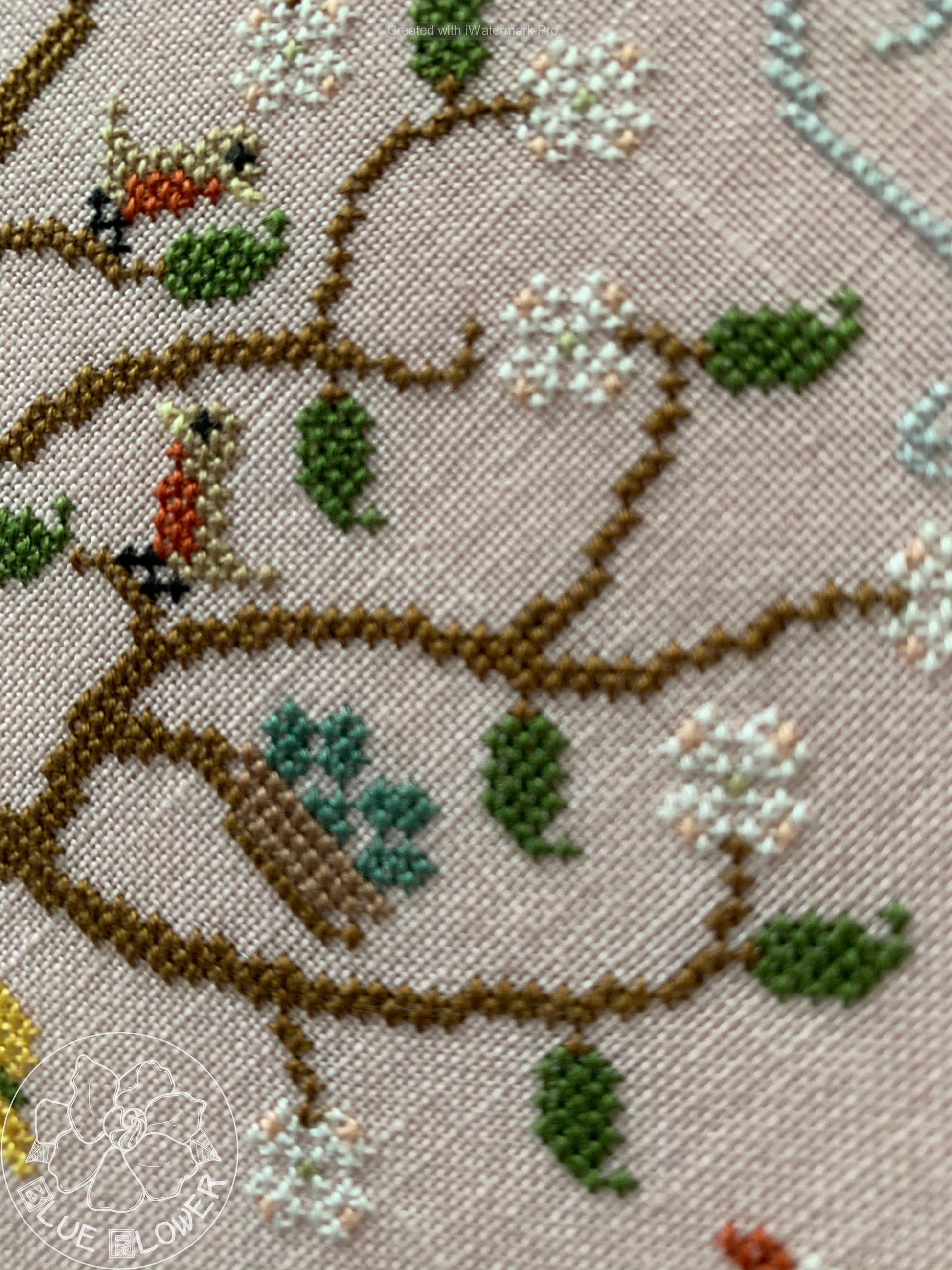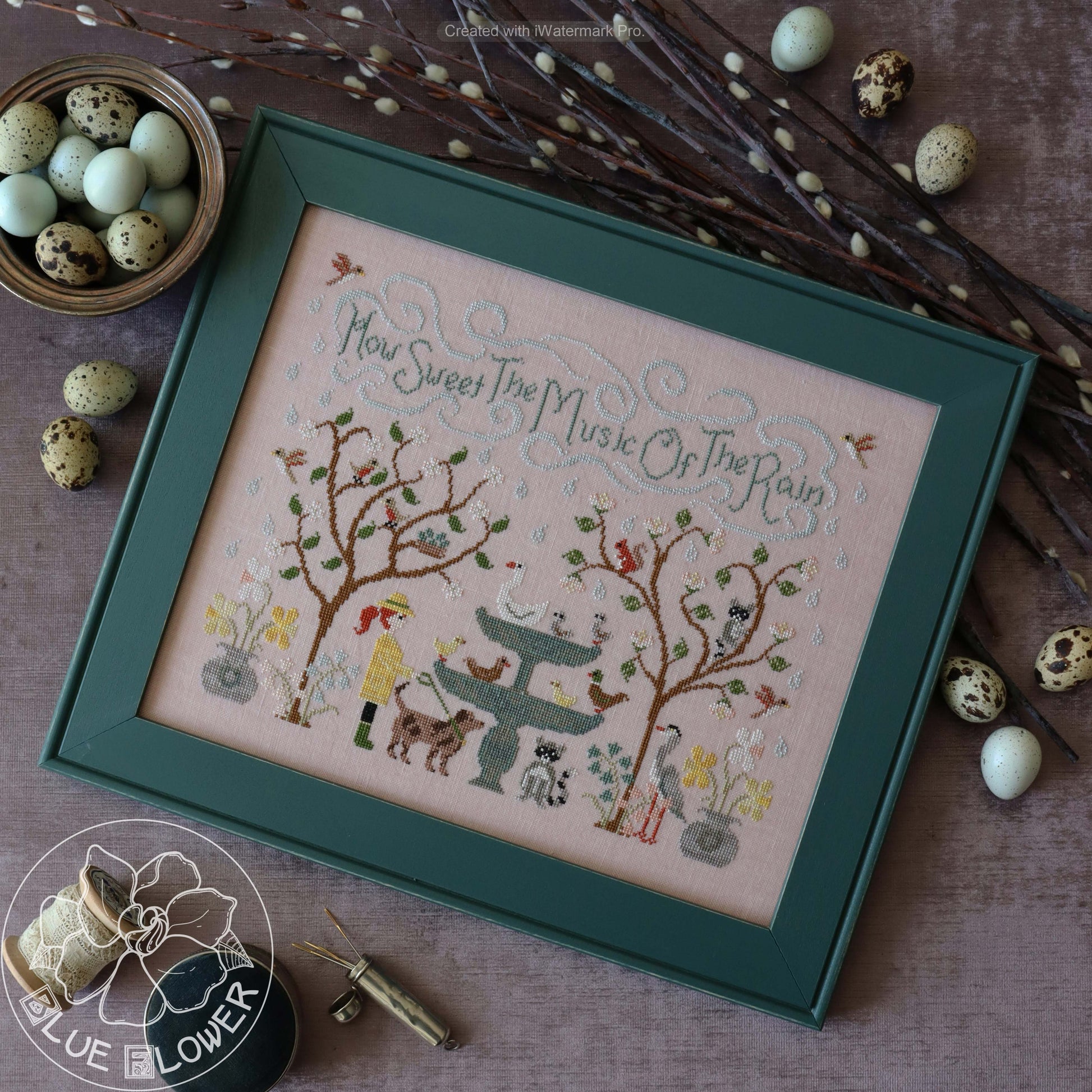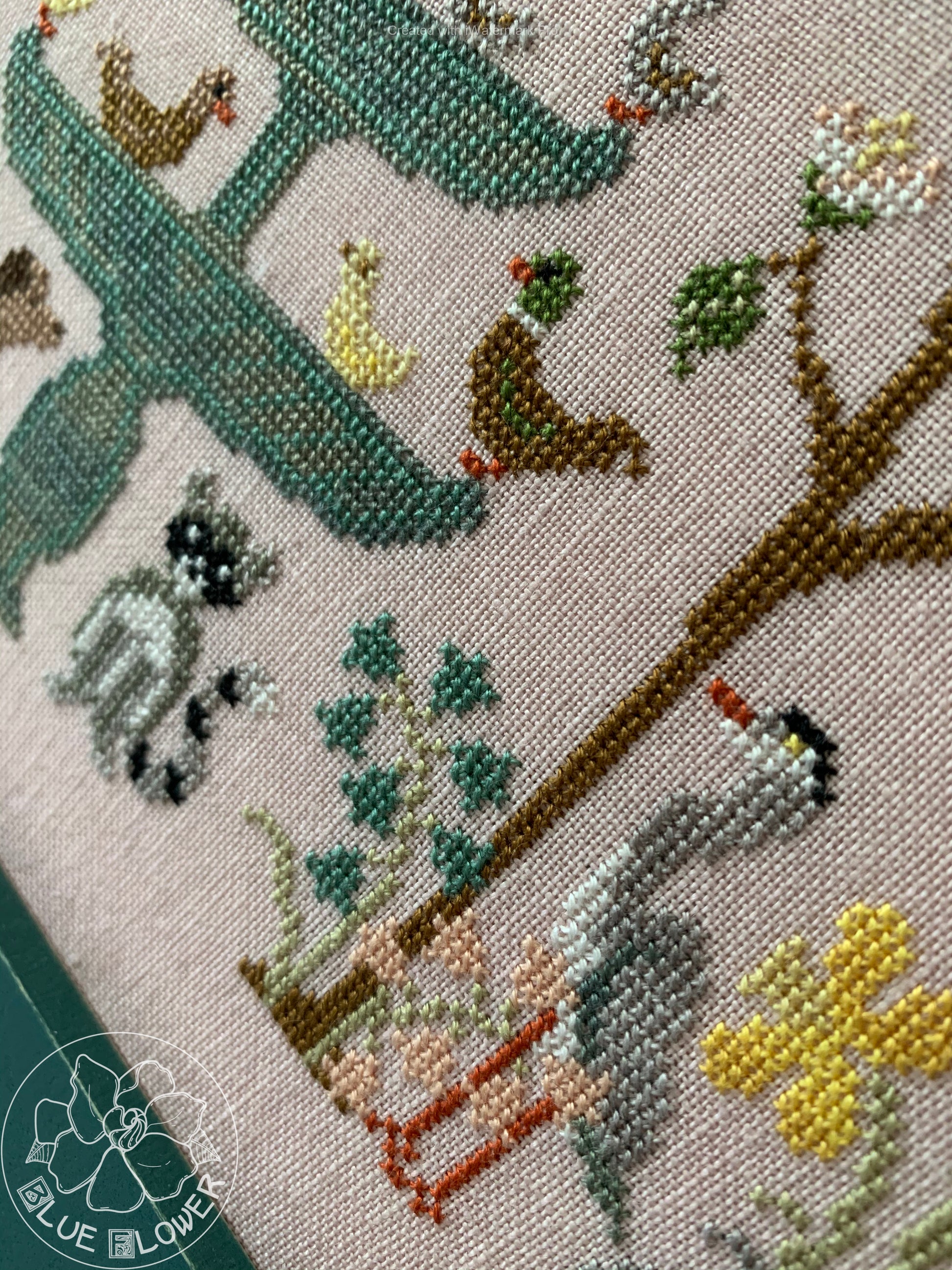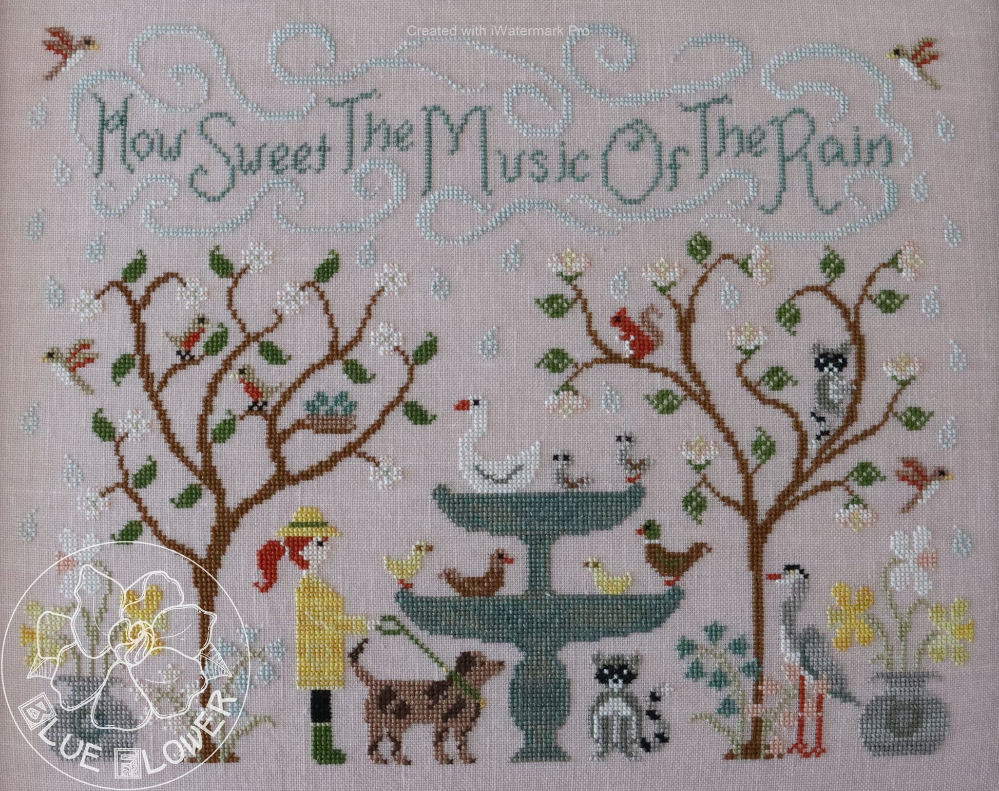 With this design I wanted to capture the wonderful feeling of soft spring rain. Living in the desert I particularly miss the rain, but I've always loved clouds and fog and drizzle. So here I have some spring flowers and trees, along with a variety of wildlife. The central feature is an enormous birdbath where ducks and ducklings, a swan and some cygnets are enjoying a splash. The model is stitched on 40 count "Bittersweet" linen from Lakeside Linens. Stitch count is 205 wide x 162 high. The chart calls for a both DMC and overdyed threads (and includes a full conversion to DMC).