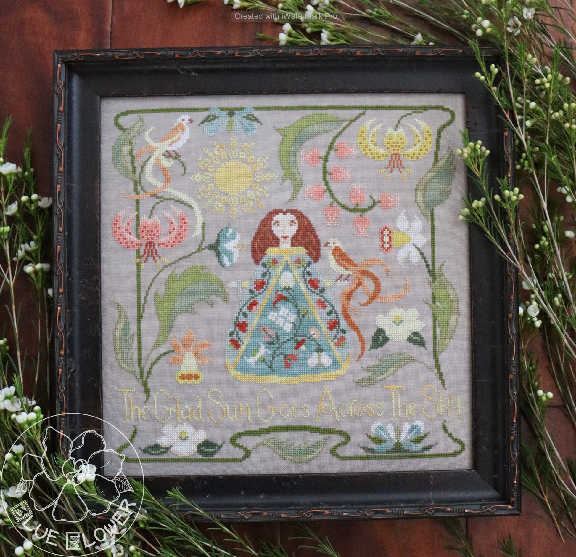 This design began as a companion piece to "Night Walked Down," but is centered around the sun. I've surrounded the main figure with an explosion of flowers in soft spring colors.
