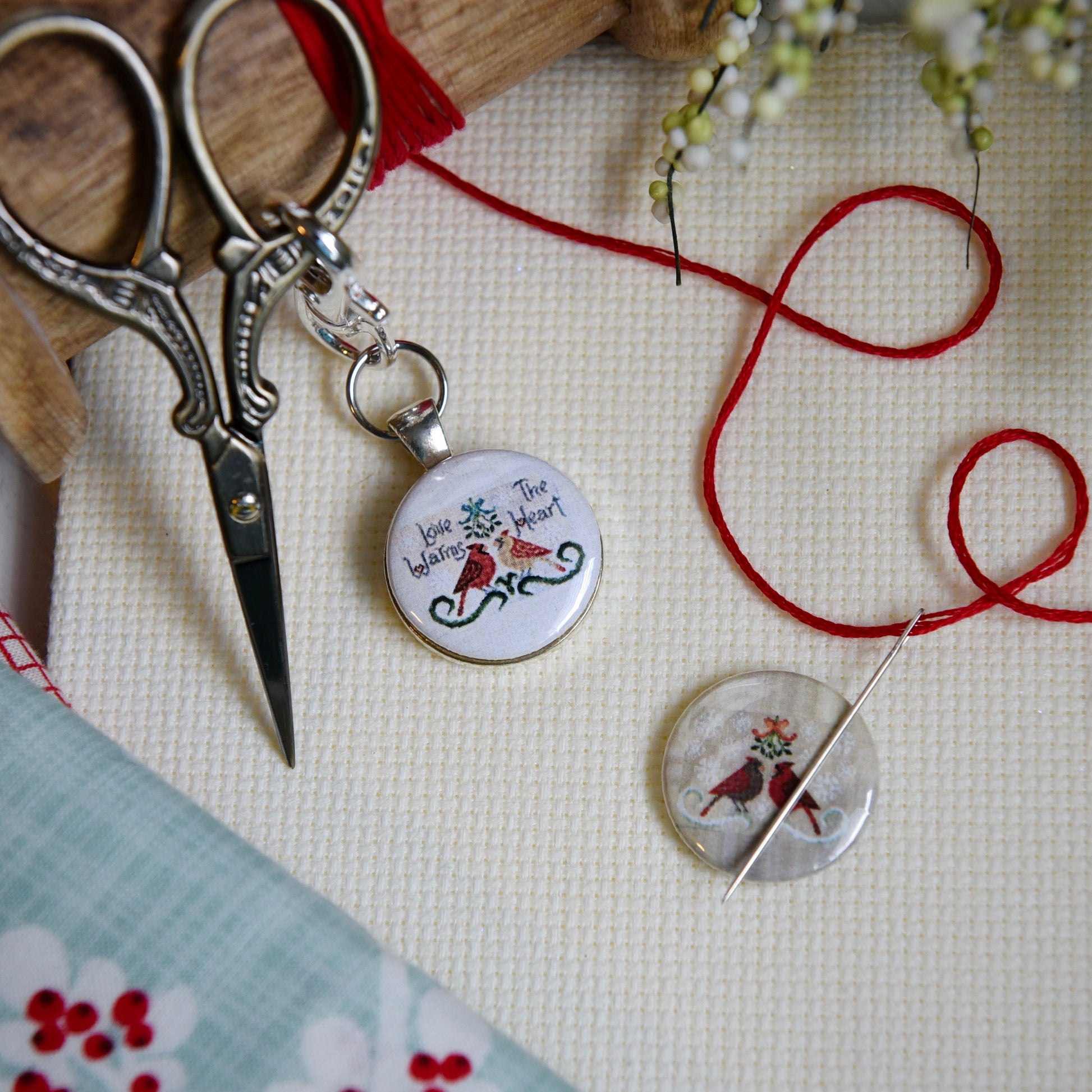 This design is my take on a winter "valentine", with two small birds and a cluster of mistletoe. One variation includes the text "Love Warms the Heart" and the other features snowflakes. The models are both stitched on 40 count "Vintage Fawn" linen from Lakeside Linens, and stitched with DMC threads. Stitch count for each version is 105 wide x 77 high. Special thanks to Acorns & Threads for finishing the models so beautifully!